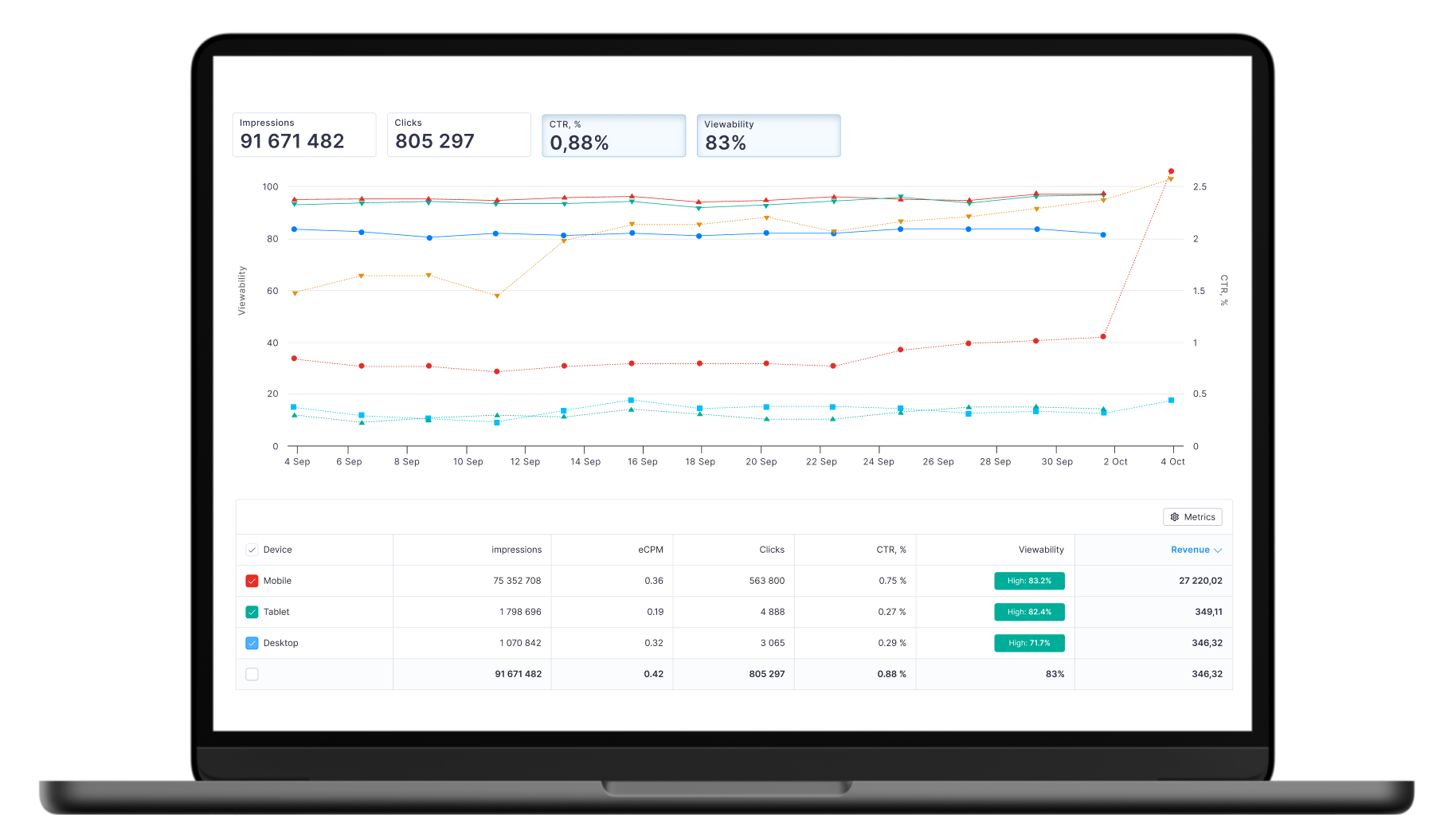 Convenient filters by sites, ad units, devices, and type of ad partner.